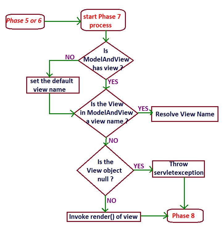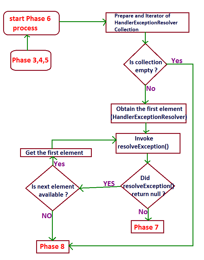 - If the handle() method throws any exception then the workflow proceeds to phase 6 , if not it proceeds to phase 5 after collecting the ModelAndView object reference returned by the handle() method.