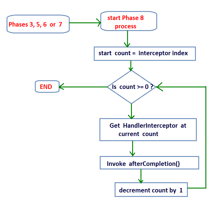- In this phase workflow starting with setting the count to one minus the interceptor's length so that the postHandle method can be invoked on the interceptor's in the reverse order.
